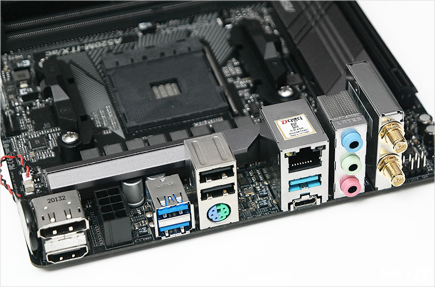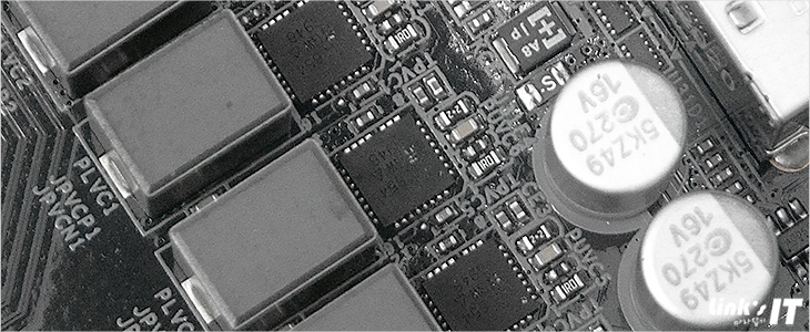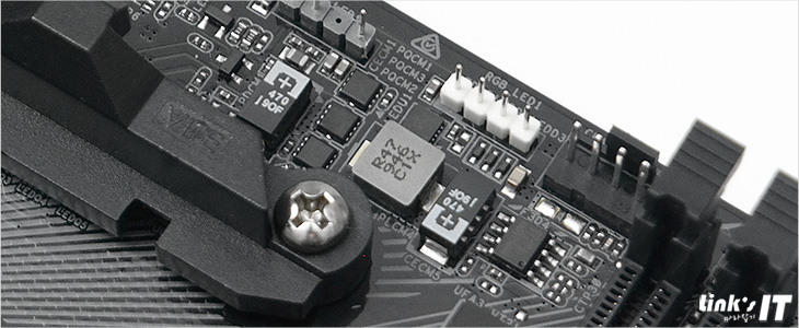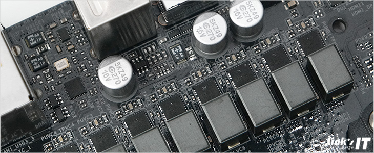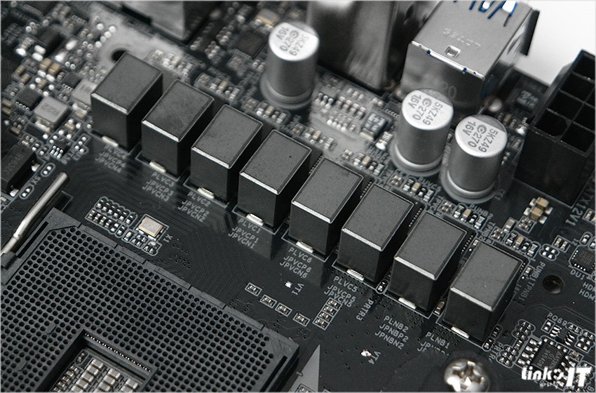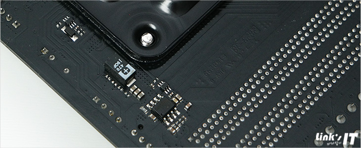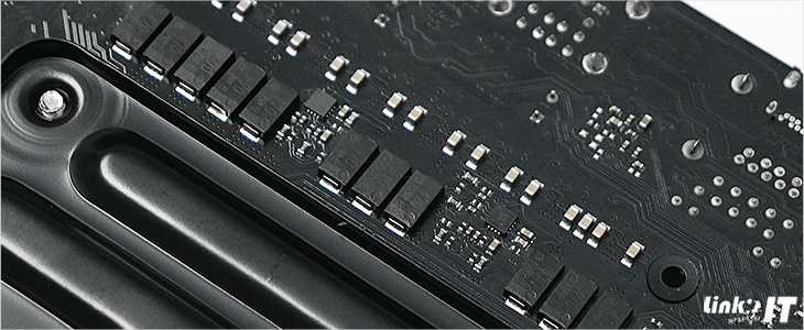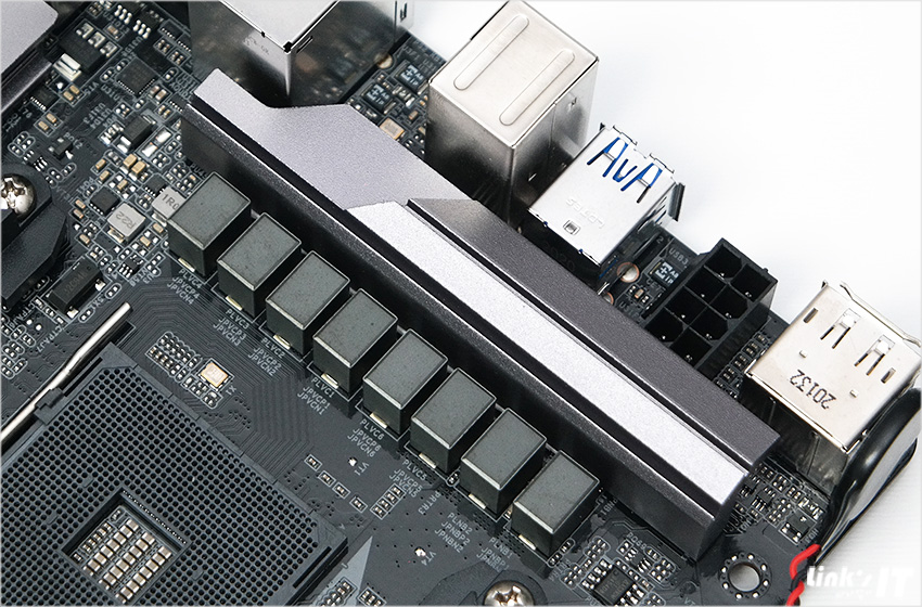디지털 8페이즈 전원부로 Dr.MOS 를 적용하였으며 그 옆으로 60A 프리미엄 쵸크가 확인됩니다. Dr.MOS에는 히트 싱크가 부착되어 빠르게 발열 해소를 하는 구조입니다. ITX에 이런 전원부는 무엇인가 생각해볼 때 작지만 강력한 컴퓨팅을 원하는 사용자들을 위한 오버클럭킹을 염두해둔 설계라 생각됩니다.