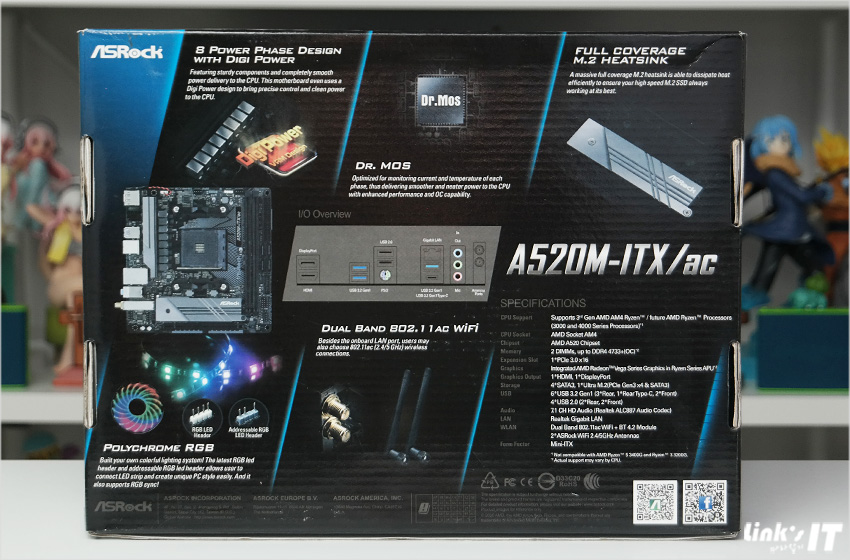 패키지 후면을 통해 이 제품이 ITX 폼팩터 메인보드에서 보여줄 수 있는 모든 것을 담아내고 있는 것을 확인할 수 있습니다. 디지털 8페이즈, Dr.MOS, NVME SSD를 위한 히트싱크, A-RGB 헤더, 그리고 WiFi 까지.. 일반 제품들과 견주어도 강력한 스펙임을 확인합니다.