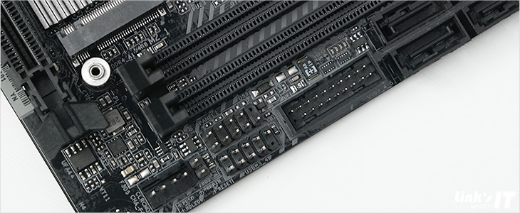 CPU 소켓 주변으로 A-RGB , RGB 헤더가 보이며 일반 메인보드 보다 좀 더 촘촘한 IC 칩들의 배열을 확인할 수 있습니다.